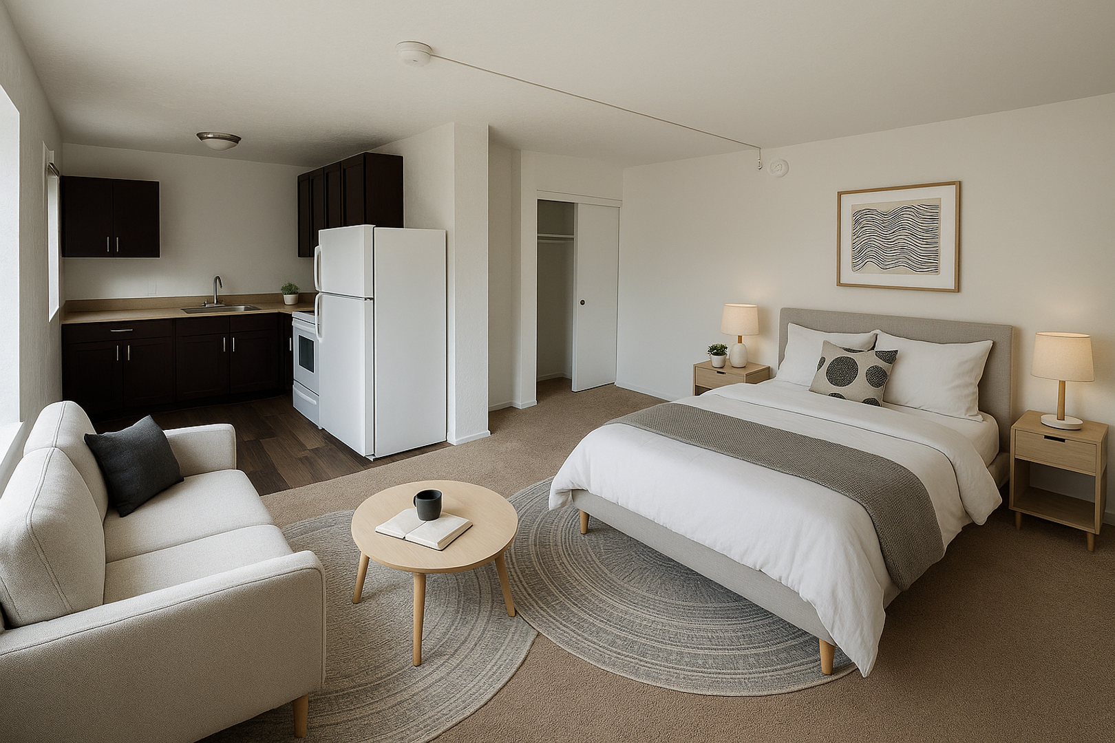 Spacious and inviting studio design featuring classic, cozy finishes